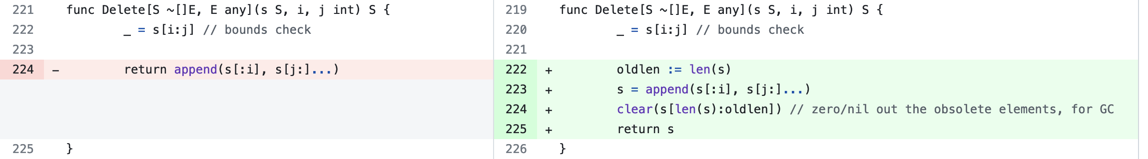 A key observation is that “setting the obsolete pointers to nil” is not as easy as it seems. In fact, this task is so error-prone that we should not put the burden on the user to write it. Out of pragmatism, we chose to modify the implementation of the five functions Compact, CompactFunc, Delete, DeleteFunc, Replace to “clear the tail”. As a nice side effect, the cognitive load is reduced and users now don’t need to worry about these memory leaks.