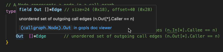 Gopls’ Hover and Definition operations now treat these links just like identifiers, so hovering over one will display information about the symbol: