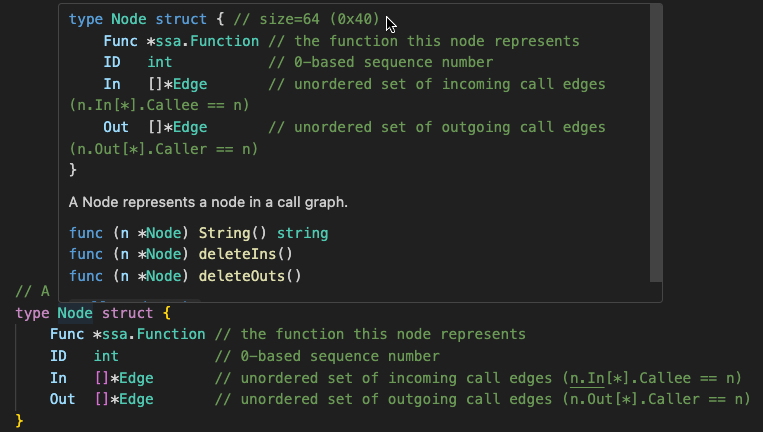 Hovering over the identifier that declares a type or struct field now displays the size information for the type: